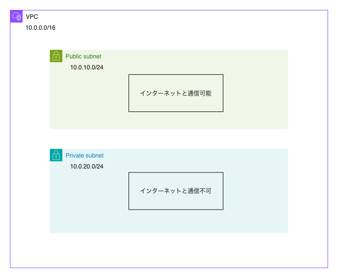 サブネットは、VPCをより小さく区切ったネットワークの単位です。AZ(アベイラビリティゾーン)単位で作成され、用途ごとに分けるのが一般的です。