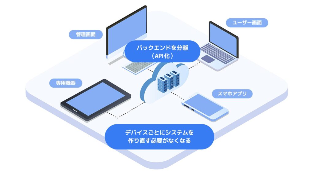 バックエンドを分離(API化)しておけば、1つの「データ処理機能」に対して、Web用、iOSアプリ(iPhoneアプリ)用、Androidアプリ用と、複数のフロントエンドを繋ぎ込むことができます。デバイスごとにシステムを丸ごと作り直す必要がなくなり、情報の整合性も保ちやすくなります。